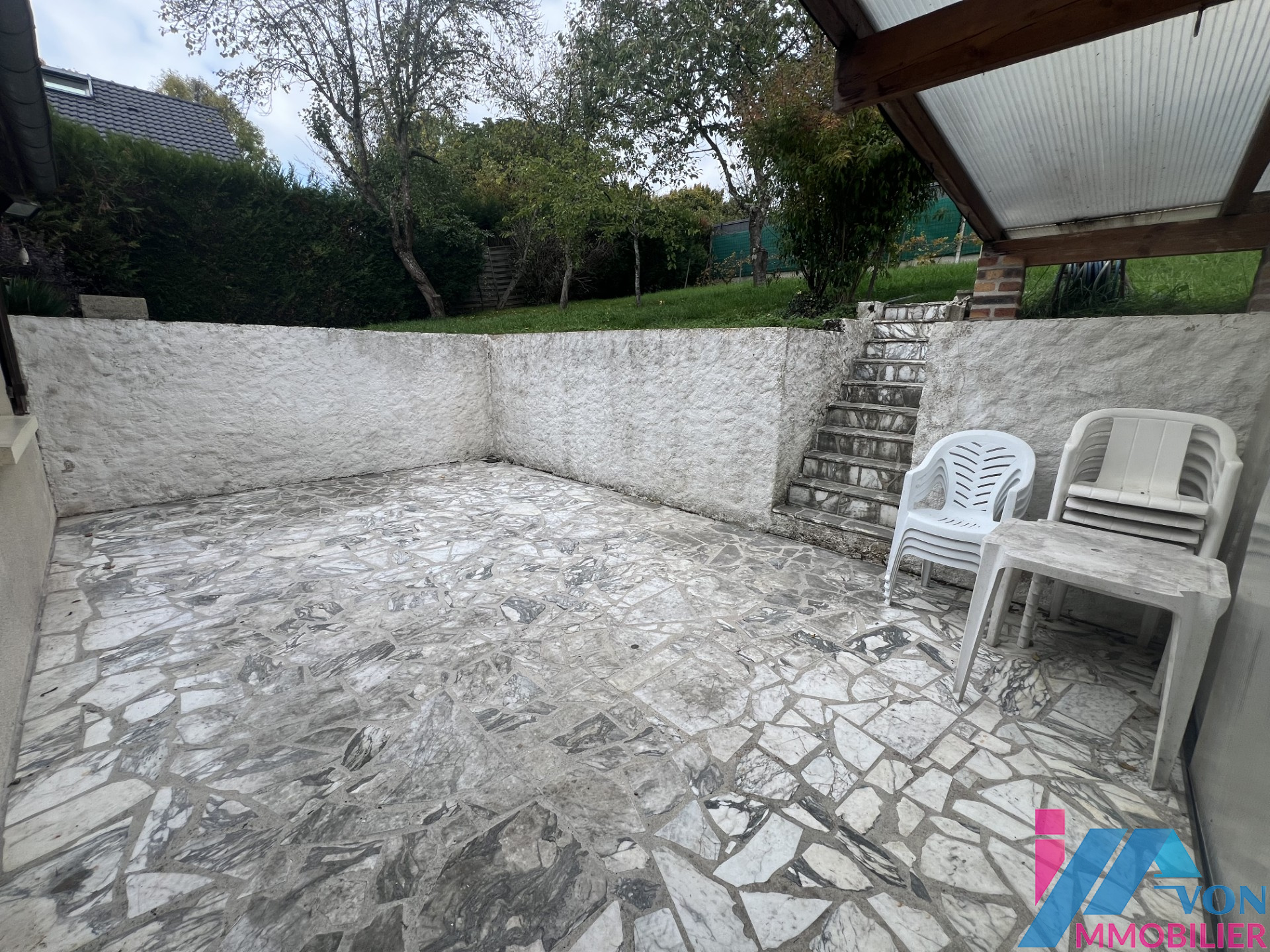 À l’extérieur, profitez d’un jardin idéal pour les enfants et d’une grande terrasse de 42 m² pour vos moments de détente. Un garage et une aire de stationnement complètent les prestations. Chauffage central au gaz.